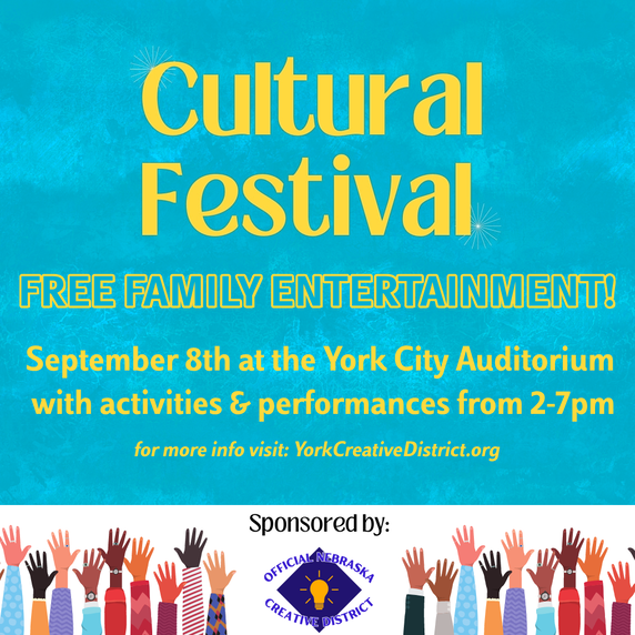 The Official Nebraska Creative District is sponsoring the York Cultural Festival on September 8, 2024, at York’s City Auditorium. The Cultural Festival aims to celebrate the many cultures that make up our community and build bridges between those from different backgrounds. There will be activities, food, music, and cultural performances for all to enjoy. This will develop an immersive experience that will grant us the opportunity to learn more about our neighbors and ways to make everyone feel welcome. We can’t wait to see you there!