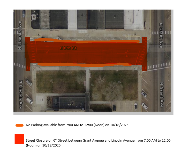 There will be a street closure on 6th Street between Grant Avenue and Lincoln Avenue from 7:00 AM to 12:00 Noon on 10/18/2025 for an Event. Please take alternate route.